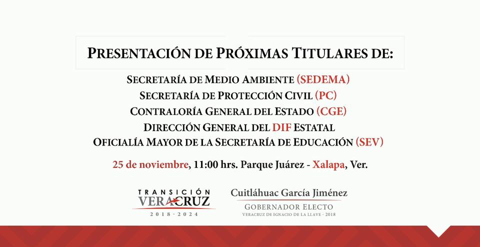 Los cargos que se habrán de dar a conocer oficialmente el próximo domingo a las 11:00 horas en el Parque Juárez corresponden a la SEDEMA, secretaría de Protección Civil, la Contraloría General del Estado, el DIF estatal y la oficialía mayor de la Secretaría de Educación de Veracruz.