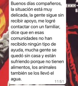 “La situación está muy delicada, la gente sigue sin recibir apoyo, me logré contactar con un familiar, dice que en esas comunidades no han recibido ningún tipo de ayuda, mucha gente se quedó sin casa y están sufriendo porque no tienen alimentos, los animales también se los llevó el agua”, denunció un familiar de damnificados en redes sociales.