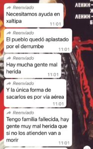 A través de mensajes vía WhatsApp, reportan que hay decenas de personas que quedaron sepultadas por los escombros, personas heridas de gravedad que requieren atención hospitalaria inmediata, desaparecidos y falta de comida y agua.