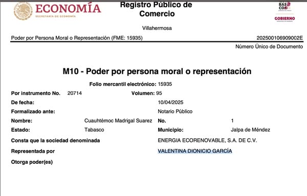 La empresa que manejaba esta miniplanta, es ENERGIA ECORENOVABLE, S.A. DE C.V., constituida como empresa en 2012 por Los últimos movimientos legales de esta empresa, fueron en abril pasado, donde Valentina Dionicio García le da poder a la abogada Martha del Rosario Ávalos Domingue y a Carlos Manuel Legendre Alemán».