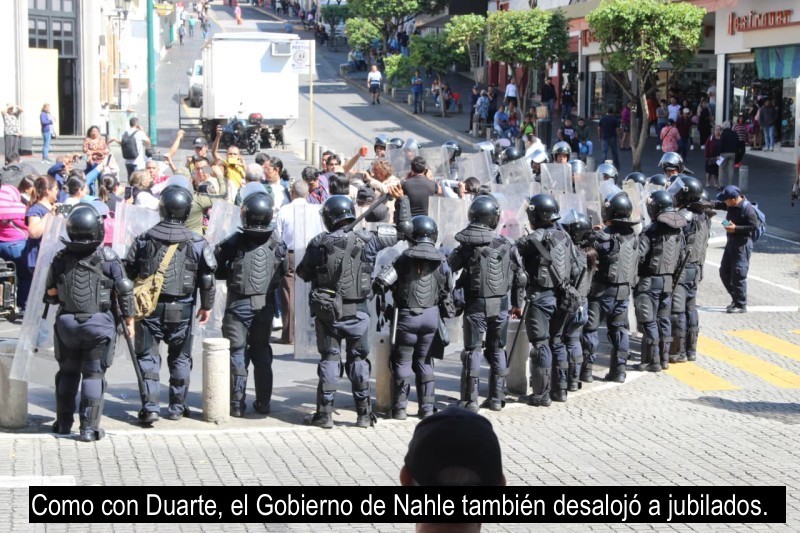 Pero encontré otro, de mucho peso: el desalojo con policías antimotines de maestros jubilados, la mayoría mujeres, que reclaman también el pago de un seguro, quienes se manifestaban en el centro de Xalapa y tenían bloqueada la calle principal frente al palacio de gobierno. La imagen revivió la del desalojo que ordenó el entonces gobernador Javier Duarte el 23 de diciembre de 2015 contra pensionados que reclamaban pagos atrasados. No hubo ninguna diferencia en el uso de la fuerza entre un gobierno y el otro, tan represor el guinda como el colorado, el del PRI como el de Morena.