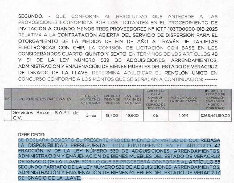 Cuando digo que el Gobierno ya no tiene dinero me baso en una nota de mi compañera reportera Isabel Ortega, quien publicó el sábado en el periódico digital La Silla Rota Veracruz que, de acuerdo al portal de la Secretaría de Salud, a partir del pasado 5 de noviembre se emitió una invitación a por lo menos tres empresas para presentar propuestas económicas para la adquisición de entre 18 mil 400 y 19 mil 600 tarjetas o vales electrónicos para igual número de trabajadores, proceso que, finalmente, el 10 de diciembre, fue declarado desierto por falta de suficiencia presupuestal. Isabel publicó una copia facsimilar del documento respectivo.