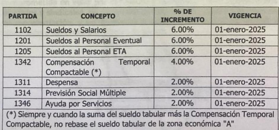 En total el aumento fue de 16%, 6% directo al salario, 4% de compensación, 2% para despensa, 2% para previsión social múltiple y 2% para ayuda por servicios, nada extraordinario con lo que se pagó en el gobierno cuitlahuista. El aumento es anual y está pactado en el contrato colectivo de trabajo con los sindicatos, aunque en el gobierno priista de Patricio Chirinos se otorgó un aumento de 20% directo al salario, algo verdaderamente histórico.
