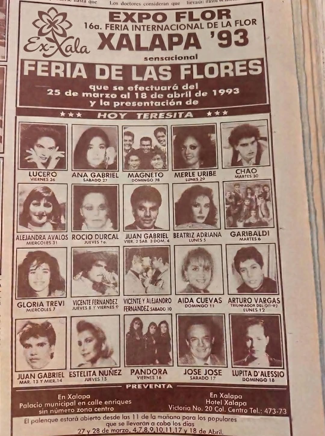 Acaba de circular en las redes la programación artística de la Explo Flor Xalapa que se celebró del 25 de marzo al 18 de abril de 1993, hace 33 años, cuando todavía no existía la Cumbre Tajín. El gobernador era Patricio Chirinos y el alcalde Armando Méndez de la Luz. Mi compañera periodista, Ana Laura Pérez Mendoza, quien replicó la imagen, no se aguantó las ganas de comentar que “Ese sí era nivel”. Pues sí. Leamos el elenco: Lucero, Ana Gabriel, Magneto, Merle Uribe, Chao, Alejandra Ávalos, Rocío Dúrcal, Juan Gabriel, Beatriz Adriana, Garibaldi, Gloria Trevi, Vicente Fernández, Alejandro Fernández, Aída Cuevas, Arturo Vargas, Juan Gabriel, Estelita Núñez, Pandora, José José y Lupia D’Alessio. Y pensar que ahora en cualquier vaso de agua se ahogan. Veracruz, y Xalapa en particular, se convertía entonces en la capital nacional del espectáculo artístico y todos querían venir.