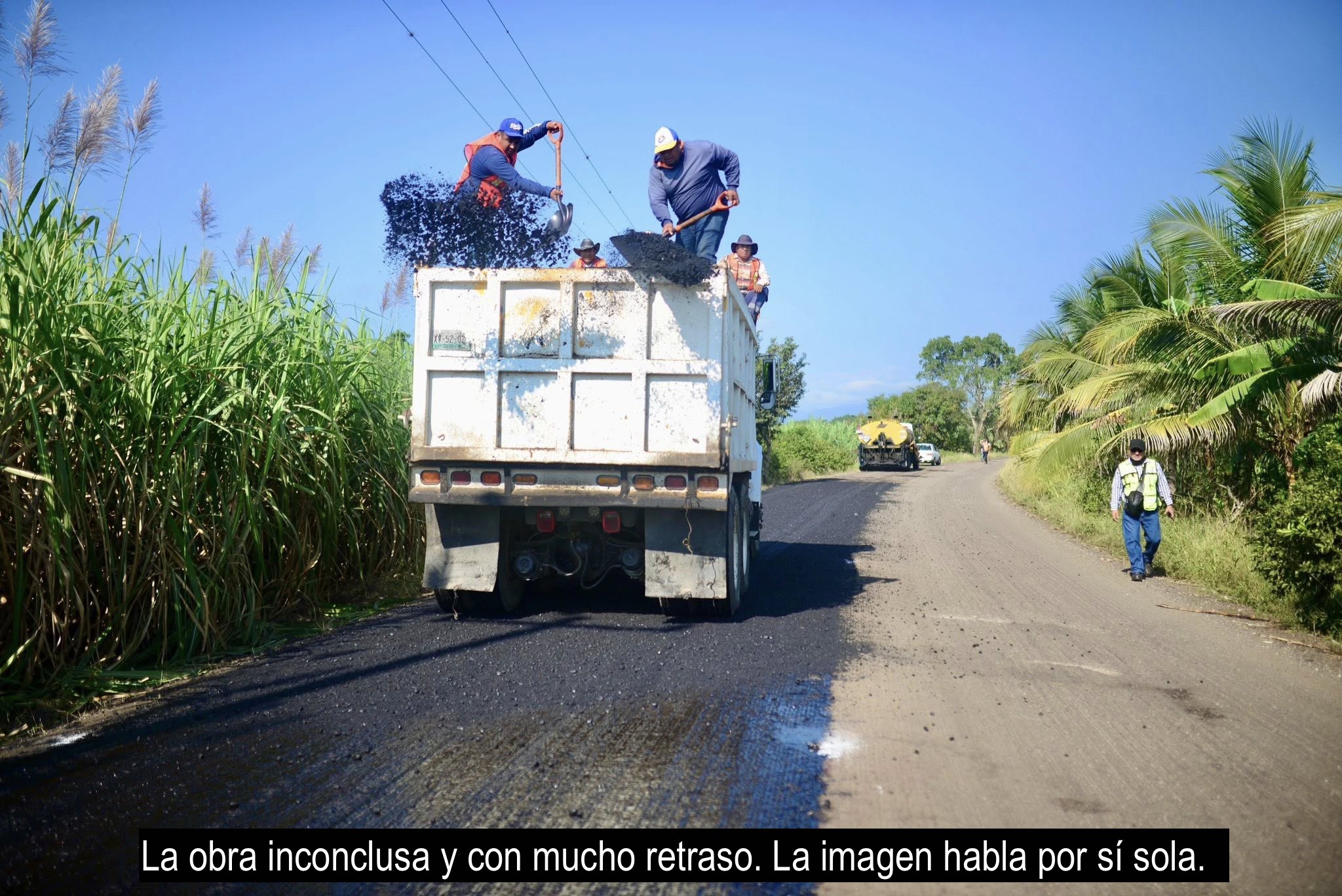 Pegó 26 fotografías, en una de las cuales, por cierto, en una curva en construcción se ve a un trabajador al lado de una máquina y enseguida a un guarura con una metralleta en la mano. Se observan carriles ya asfaltados y otros preparados con la base esperando, camiones con asfalto, carros cisternas regando agua, rastrilladoras emparejando, hombres trabajando pero, sin duda alguna, una obra a medias, que no se necesita ser ingeniero de caminos para asegurar que no quedará concluida en los 13 días que restan de 2025, 10 si se le restan el 24, 25 y 31 de diciembre, aunque se incluyan los dos sábados y domingos que faltan.