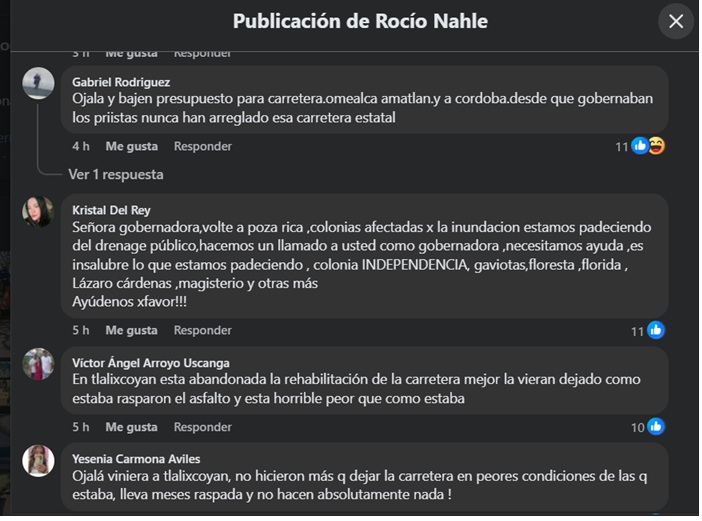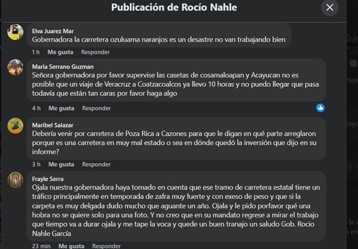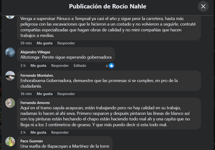 No se trata de críticas del periodismo crítico nada más por criticar, se trata de testimonios de quienes son los mejores supervisores de obras: los habitantes de las comunidades y los usuarios de caminos y carreteras, por eso digo que esta historia se escribe sola. Copio algunos de los comentarios en el muro de la gobernadora que hablan por sí solos.